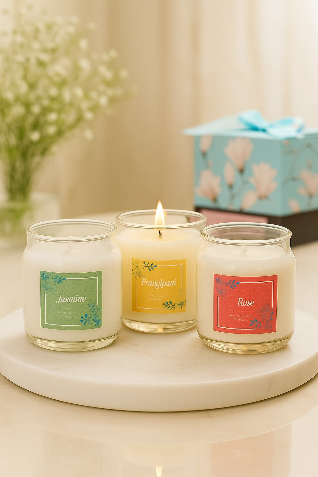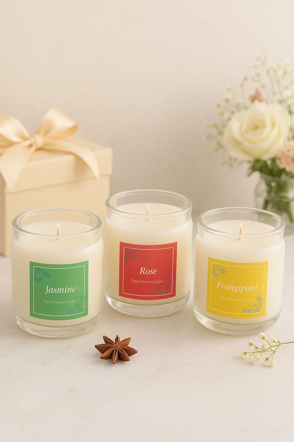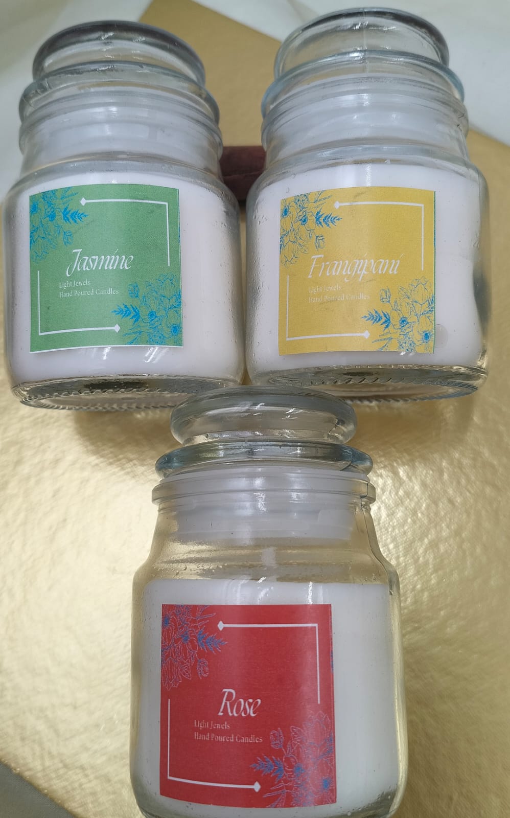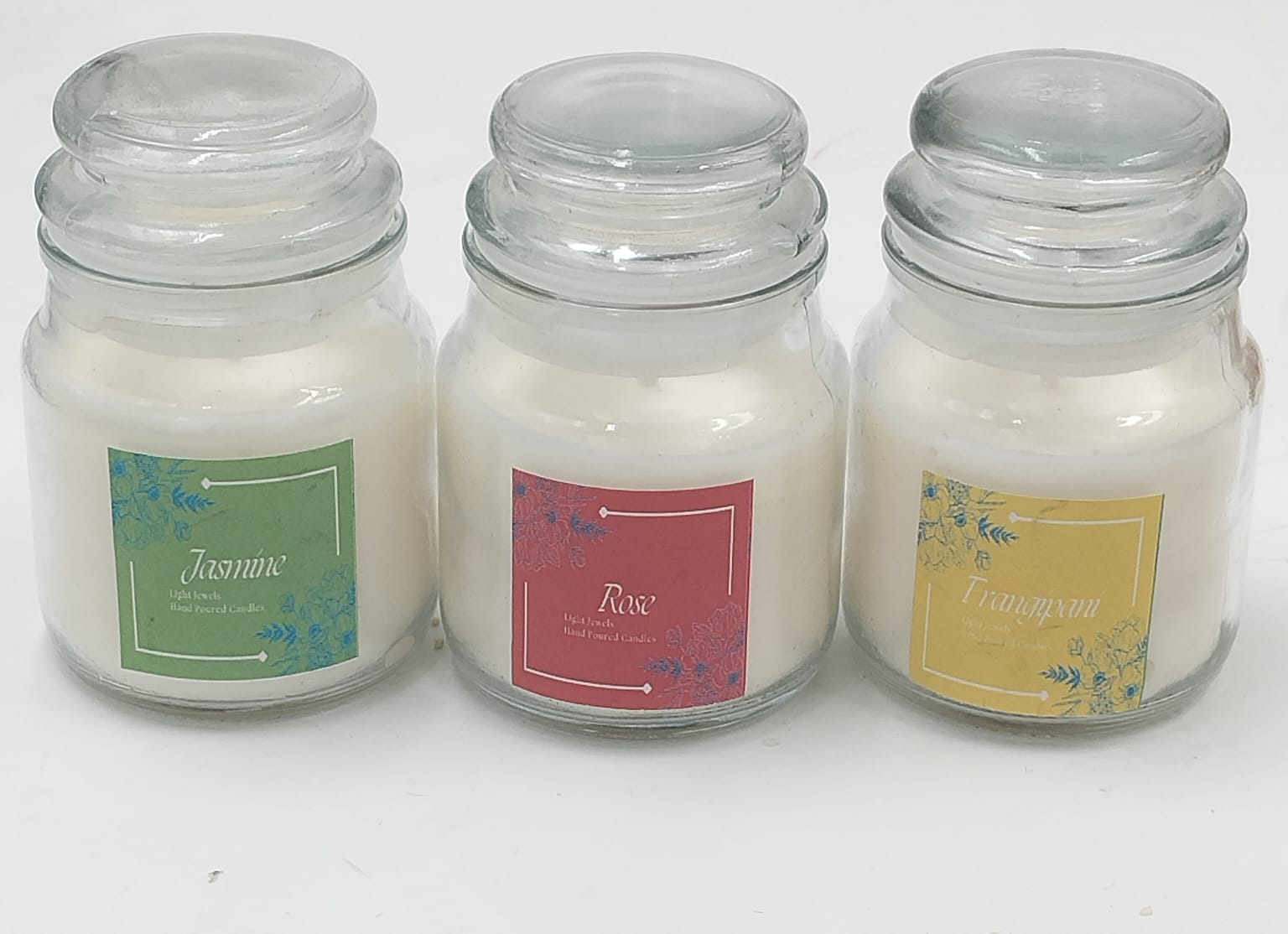 Bring home the lingering fragrance of Roses, Jasmine & Frangipani in our 3 candle jar set.