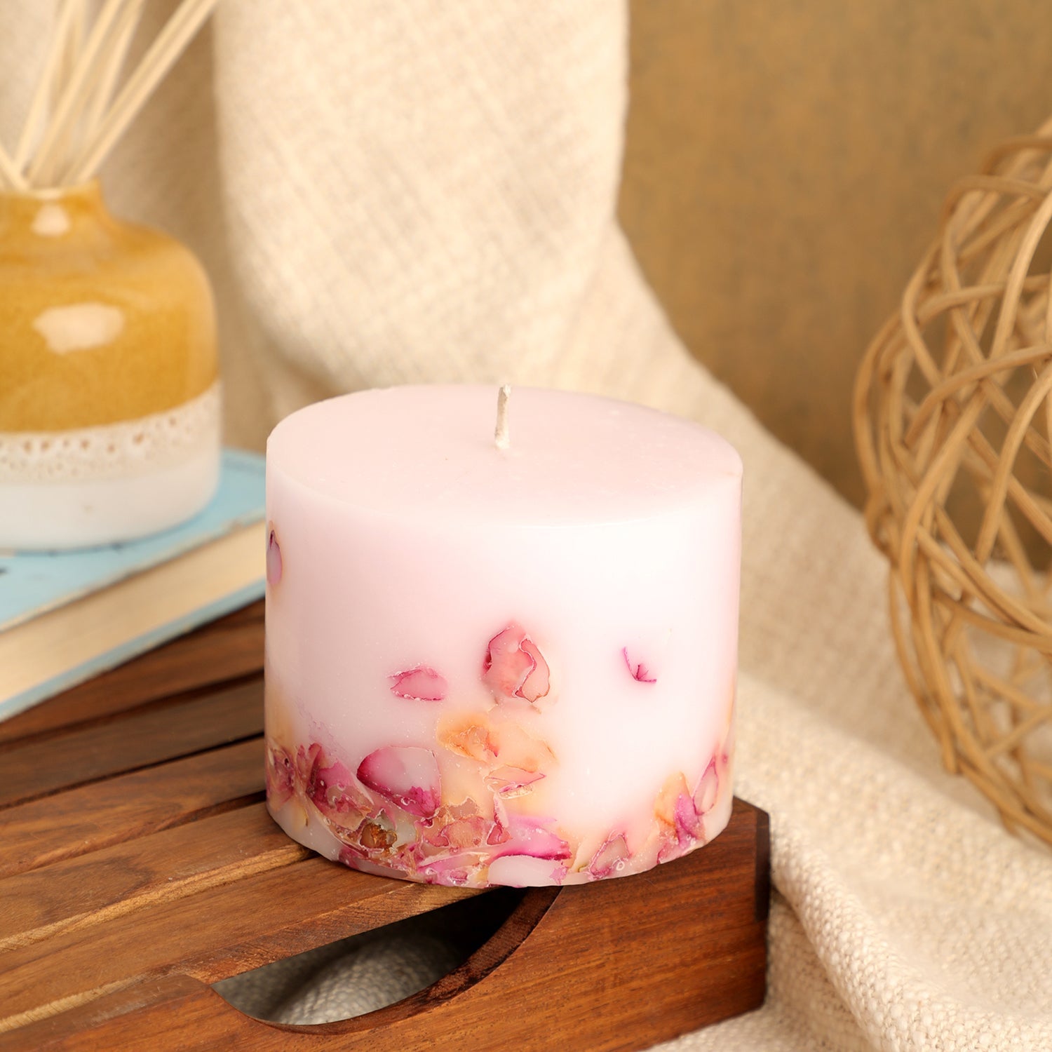 Immerse yourself in the delicate aroma of roses through our garden rose pillar candles. With the tinge of hand-embedded red rose petals finish, these candles fits just right at the centerpiece for those special evenings