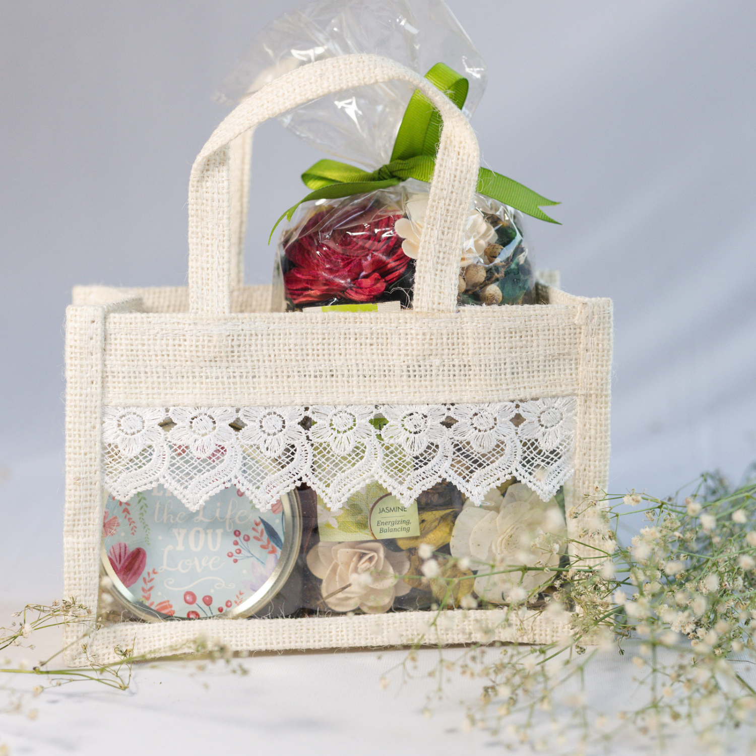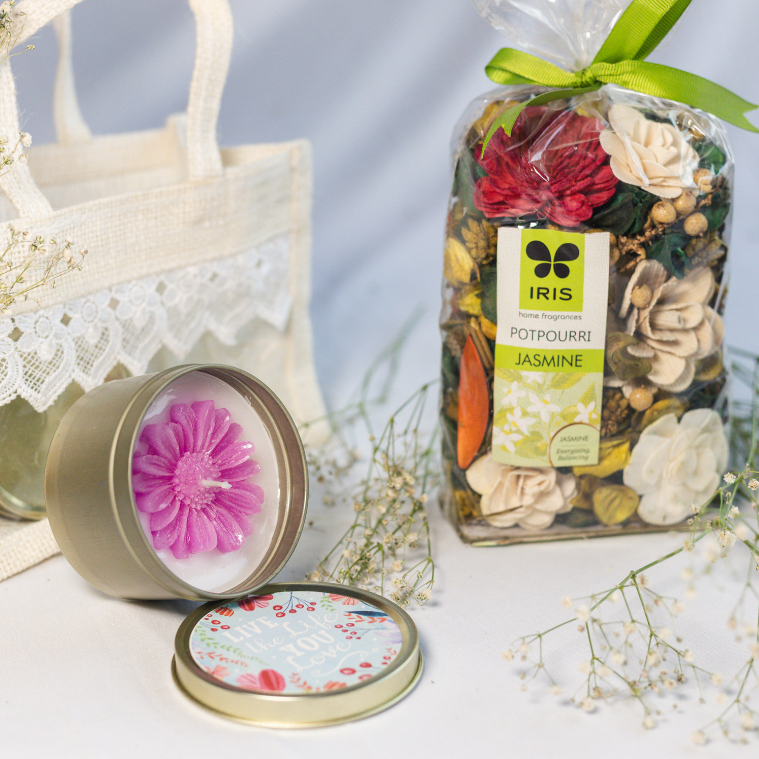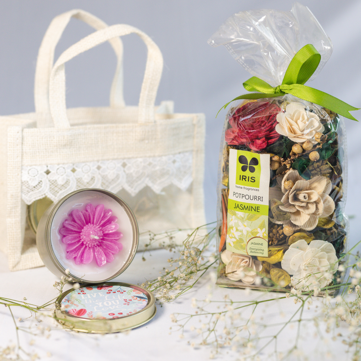 A thoughtful gift of Potpourri and Lavender Scented tin candle .The 2 neatly sit in a Jute Bag which can be reused as desired. Both potpourri and candle will your home with a lasting aroma. The potpourri is in Jasmine fragrance. Experience 2 different floral notes in 1 gift!