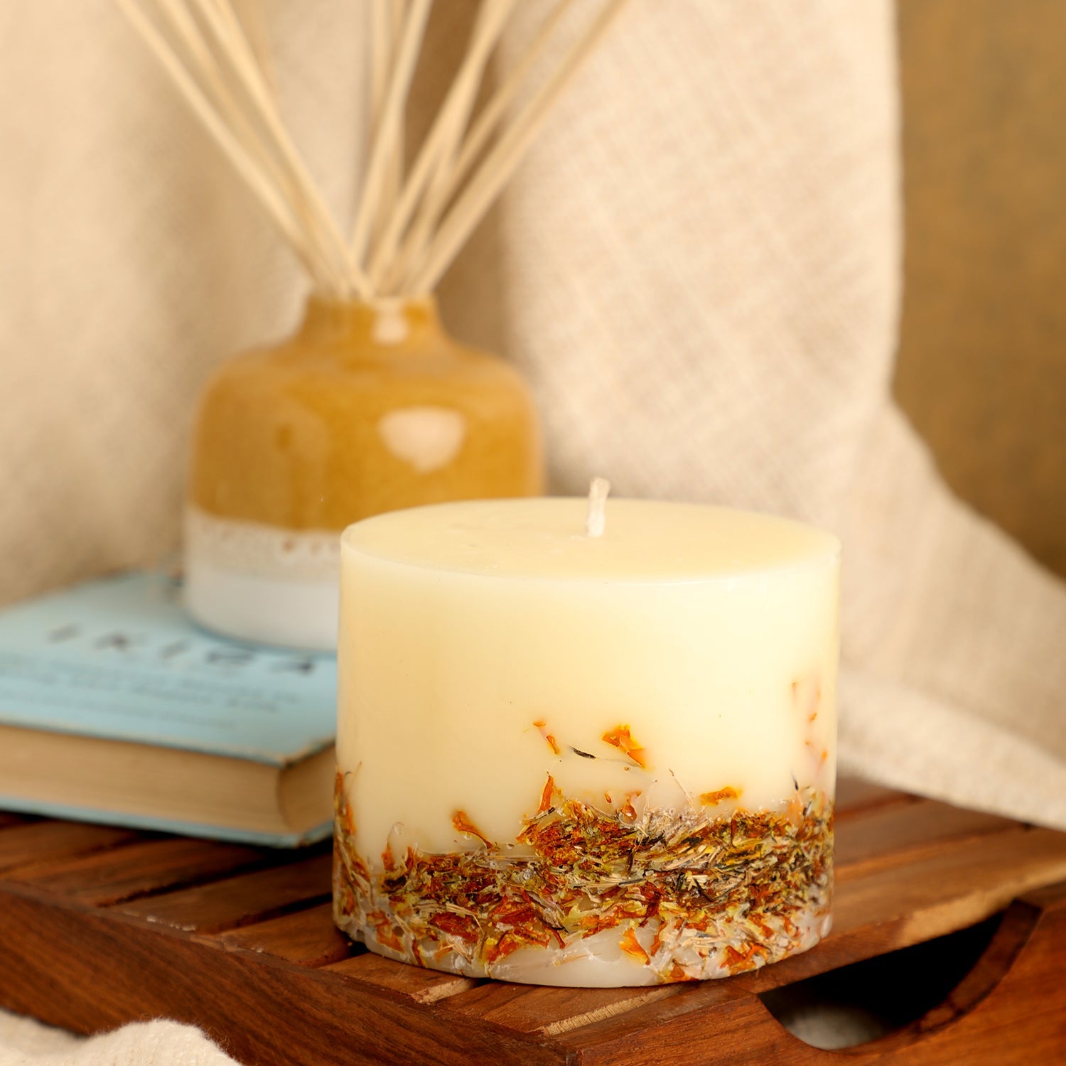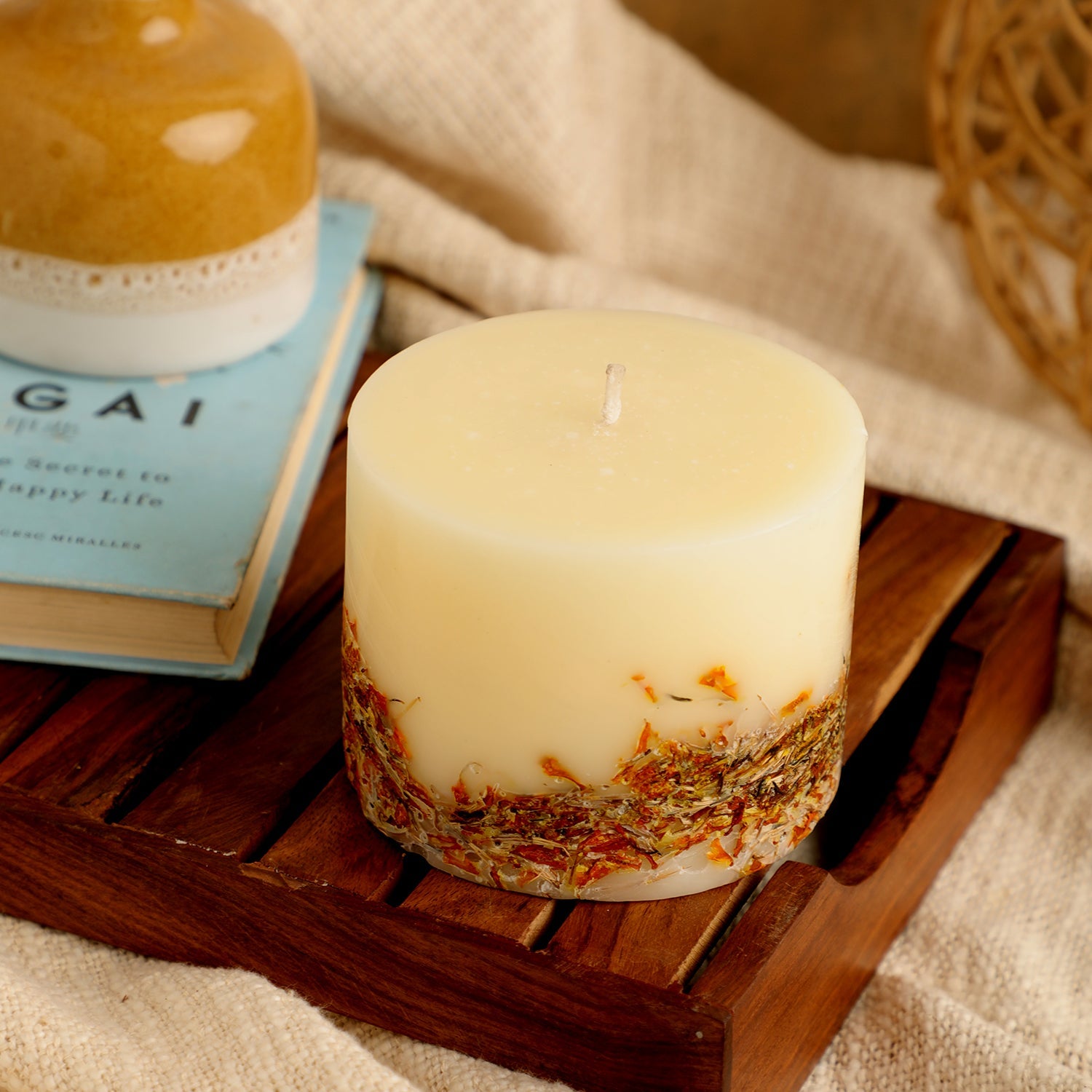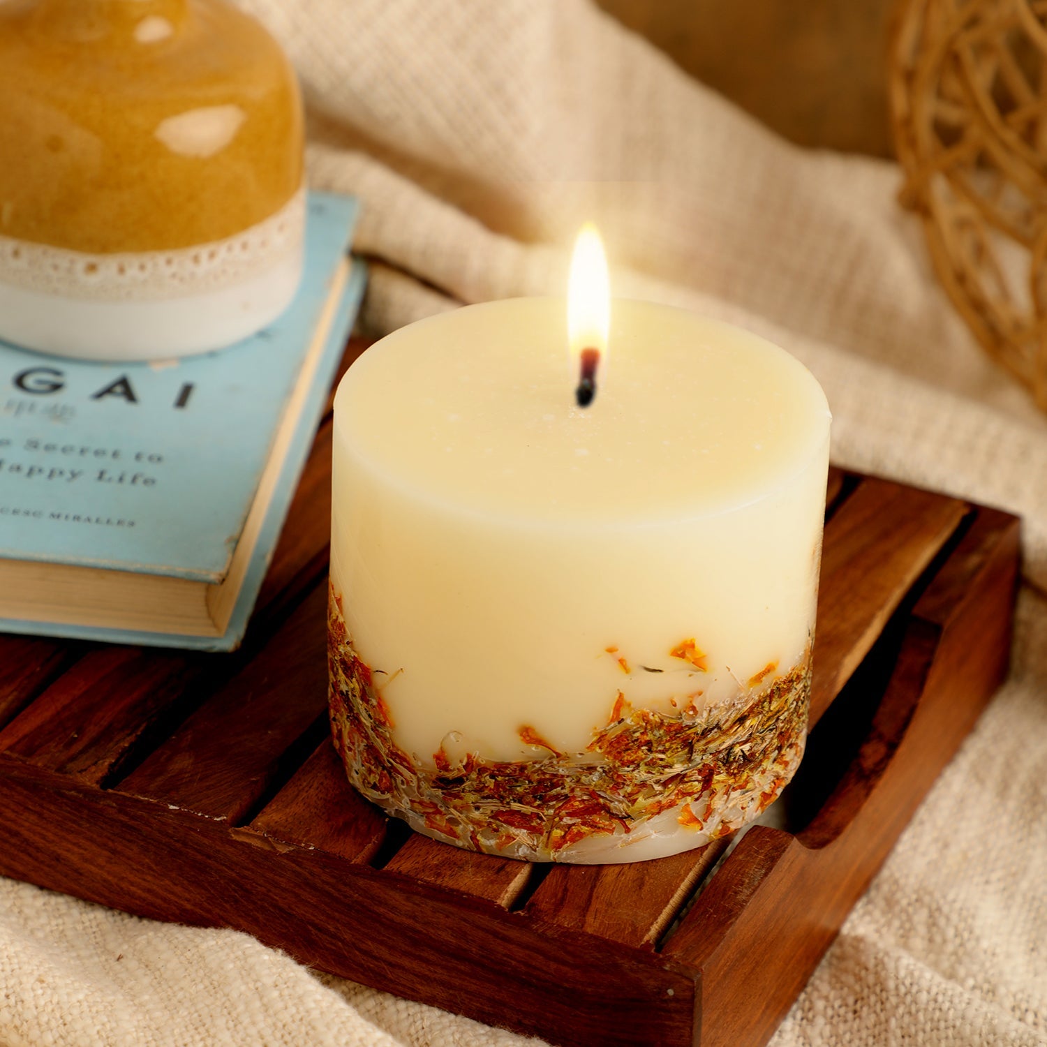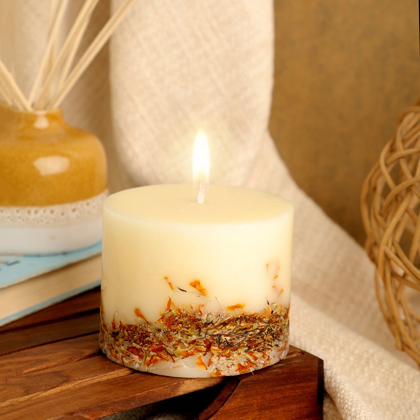 Invigorate your senses through the vibrancy and musky-ness of our Marigold pillar candles. These gently caressed candles, embellished with bright petals, will lighten your space inside and out. A fragrant delight for every occasion.