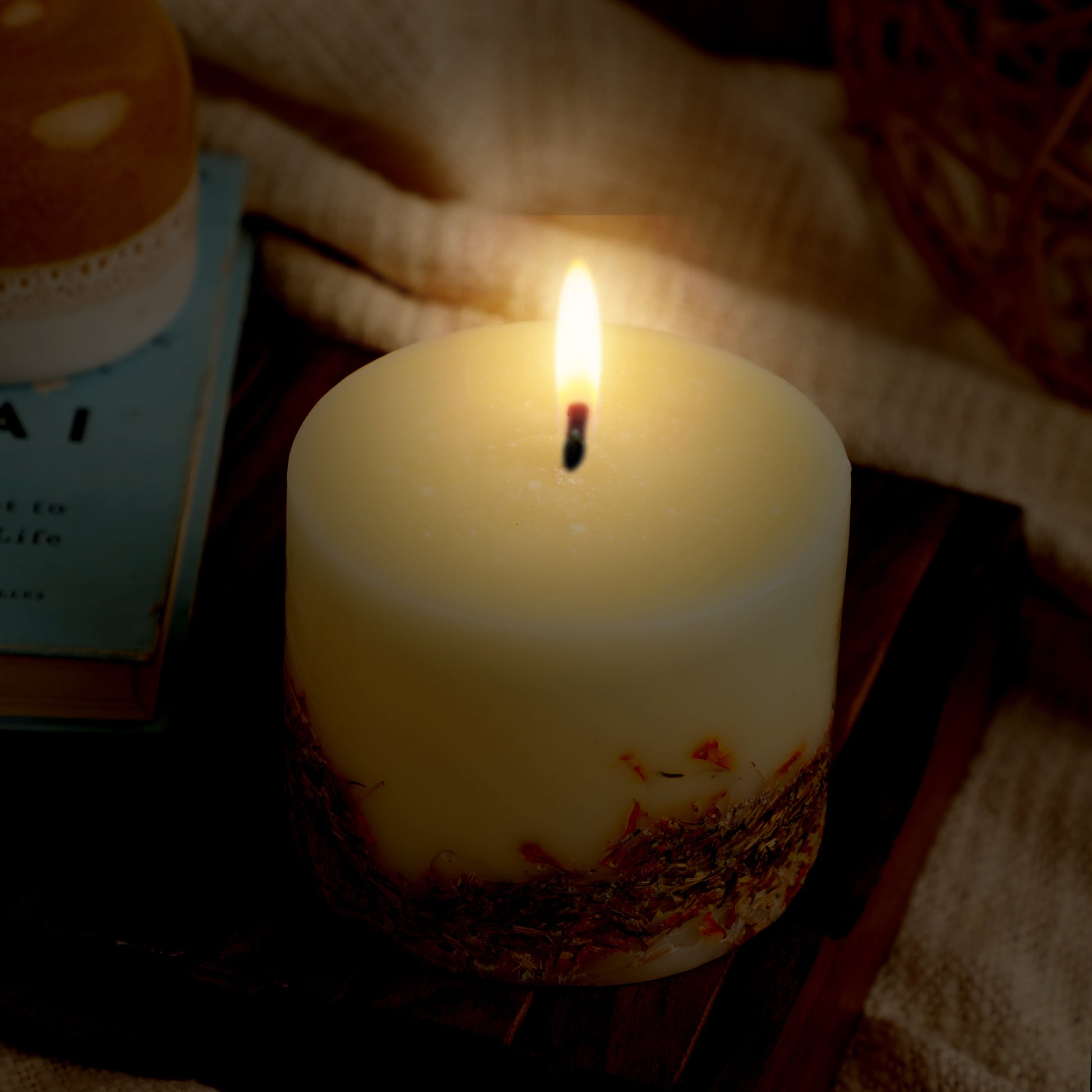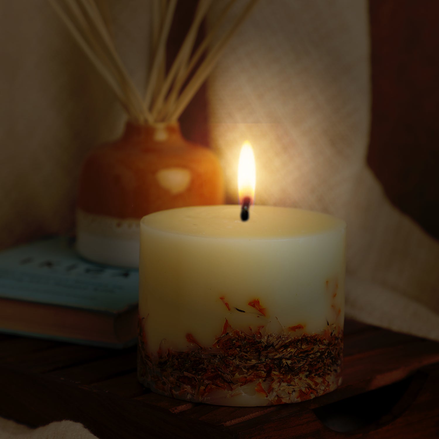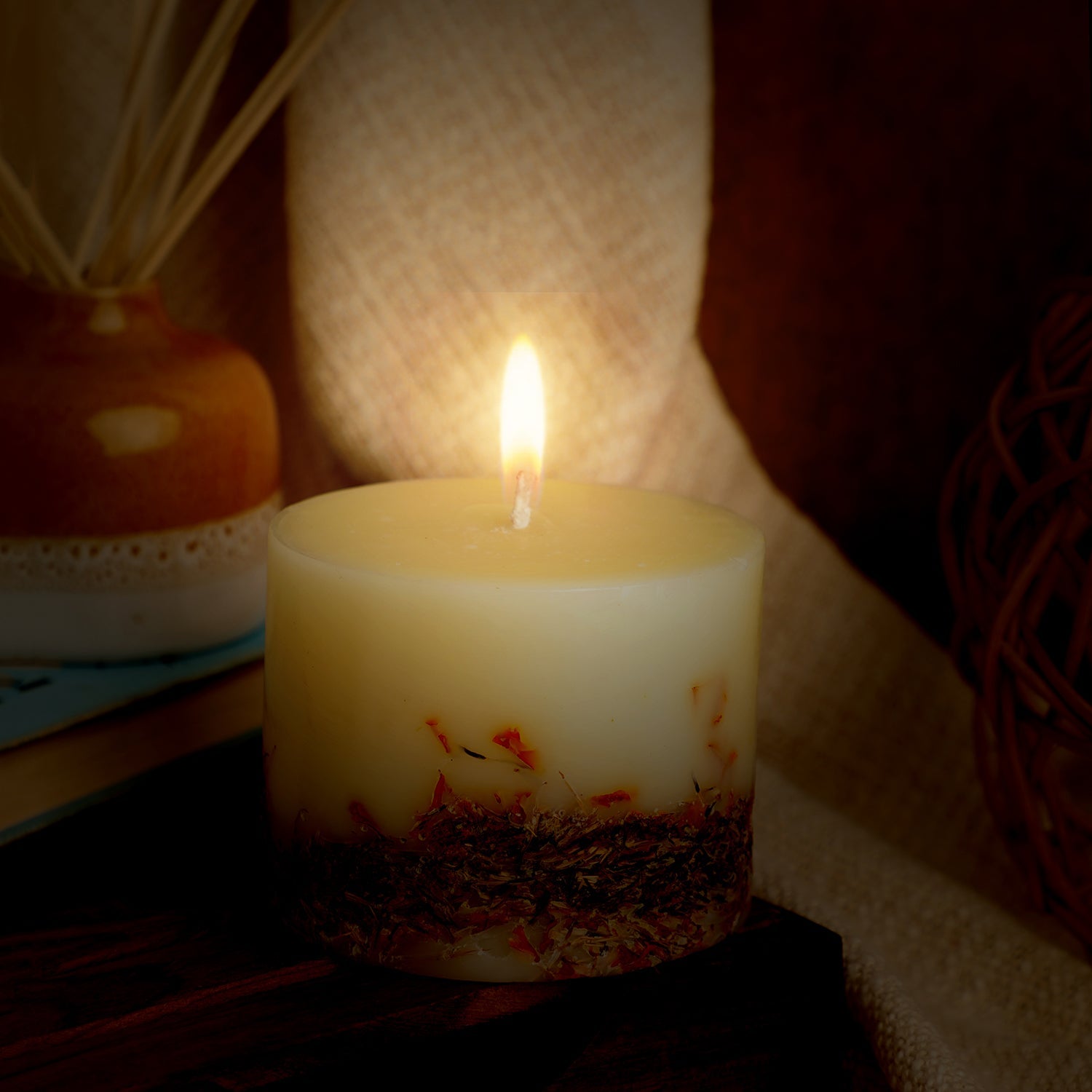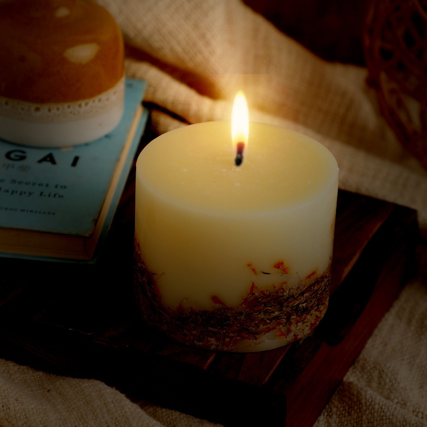 Invigorate your senses through the vibrancy and musky-ness of our Marigold pillar candles. These gently caressed candles, embellished with bright petals, will lighten your space inside and out. A fragrant delight for every occasion.