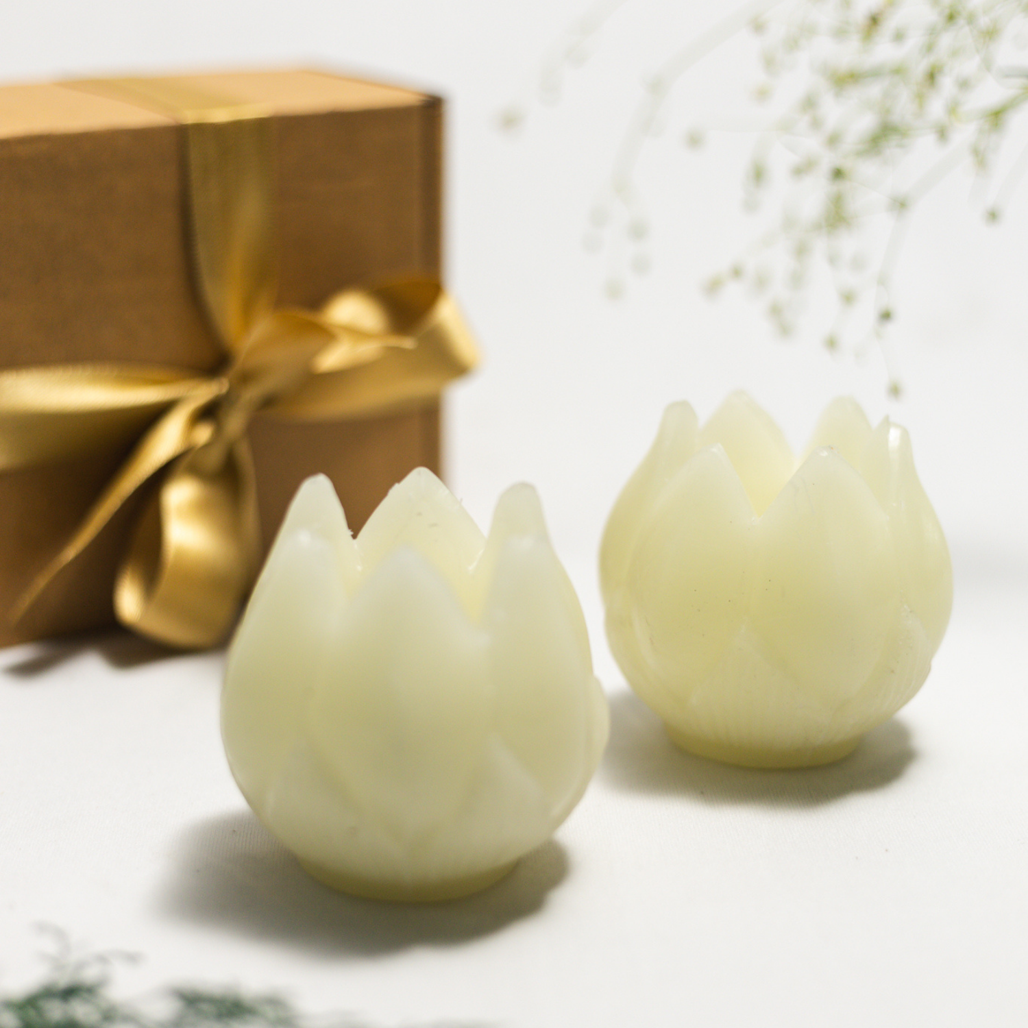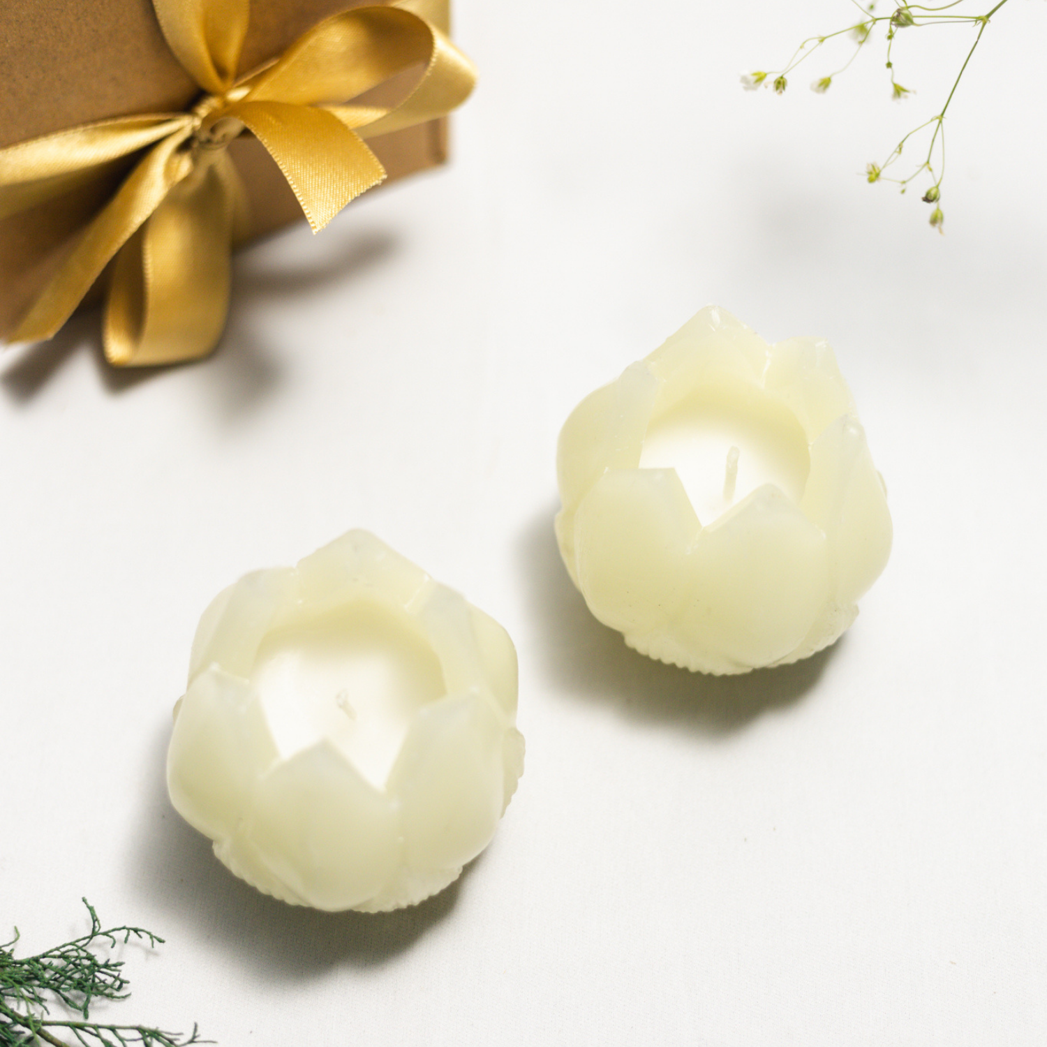 Ivory Lotus hurricane candles to complete the traditional home decor. The 2 wax pieces will illuminate your home with grace and sophistication.