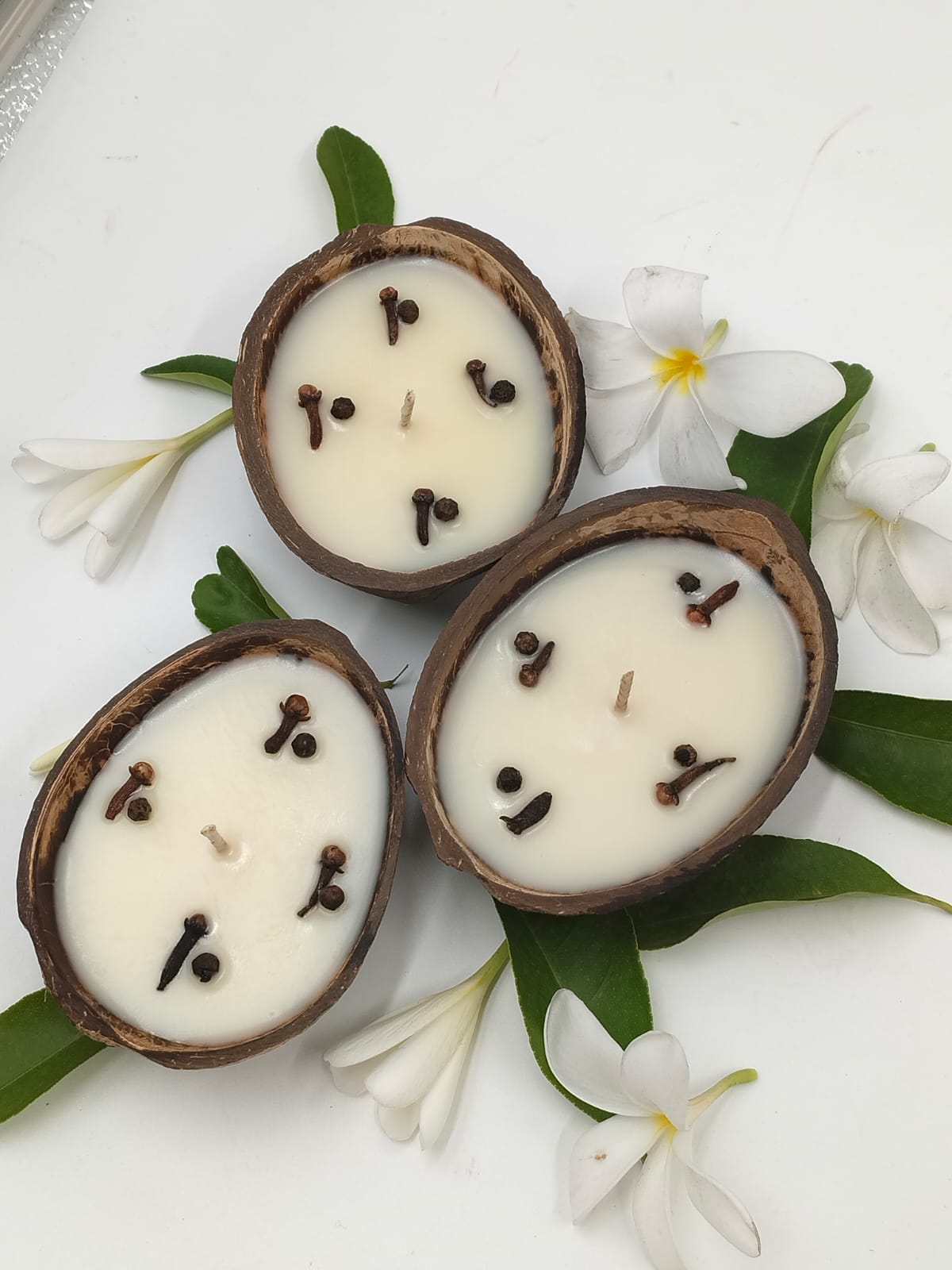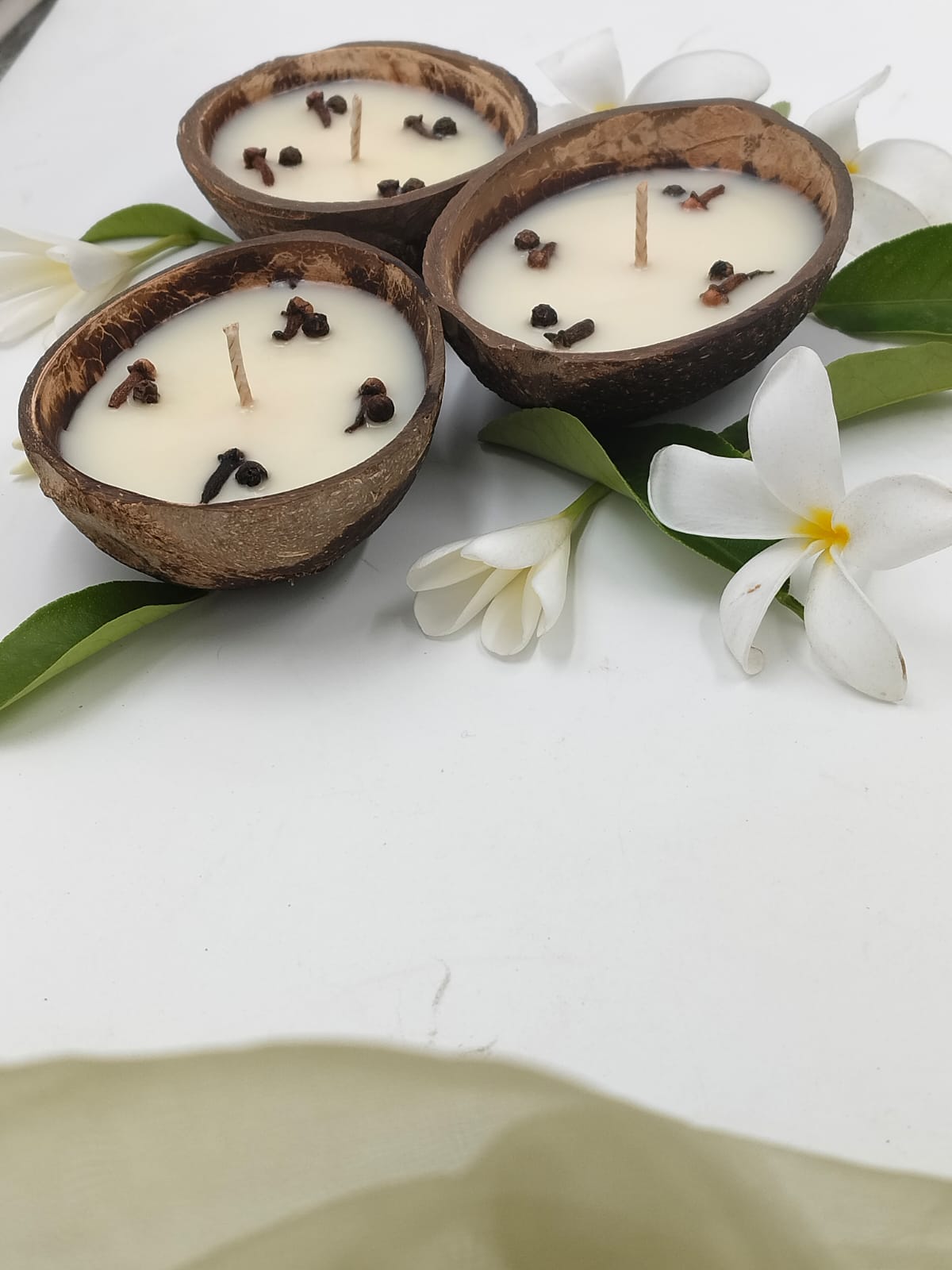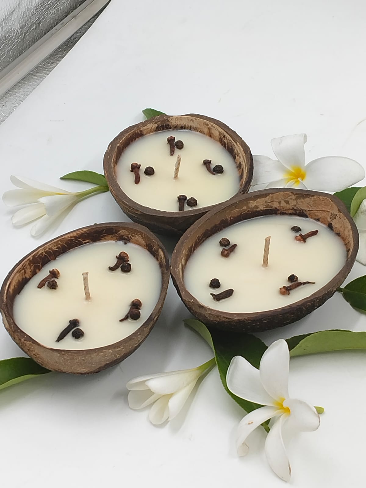 Natural coconut shells filled with soy and coconut organic wax blend. These 3 shells filled with the exotic fragrance of Frangipani which pairs well with all things tropical specially the coconut.