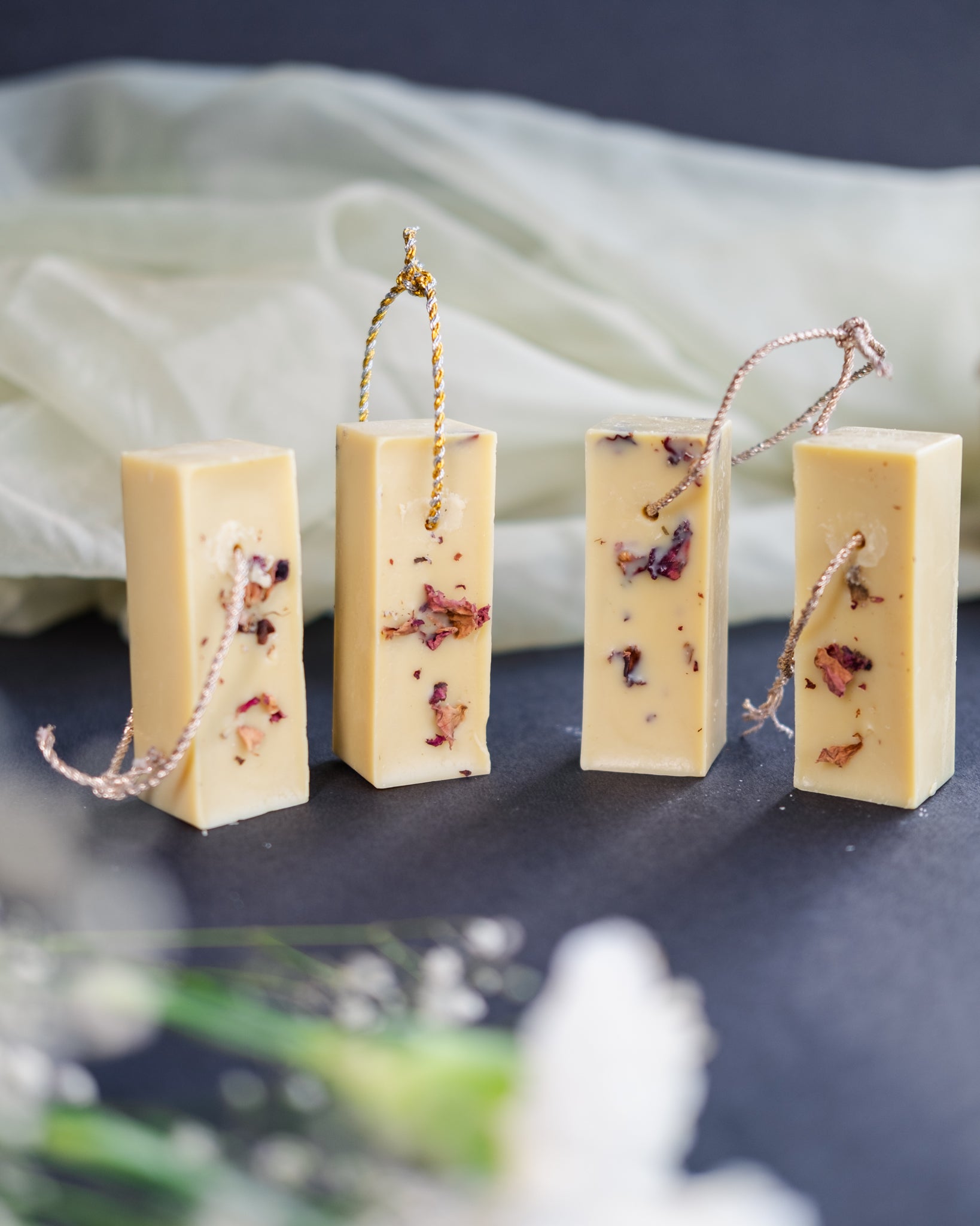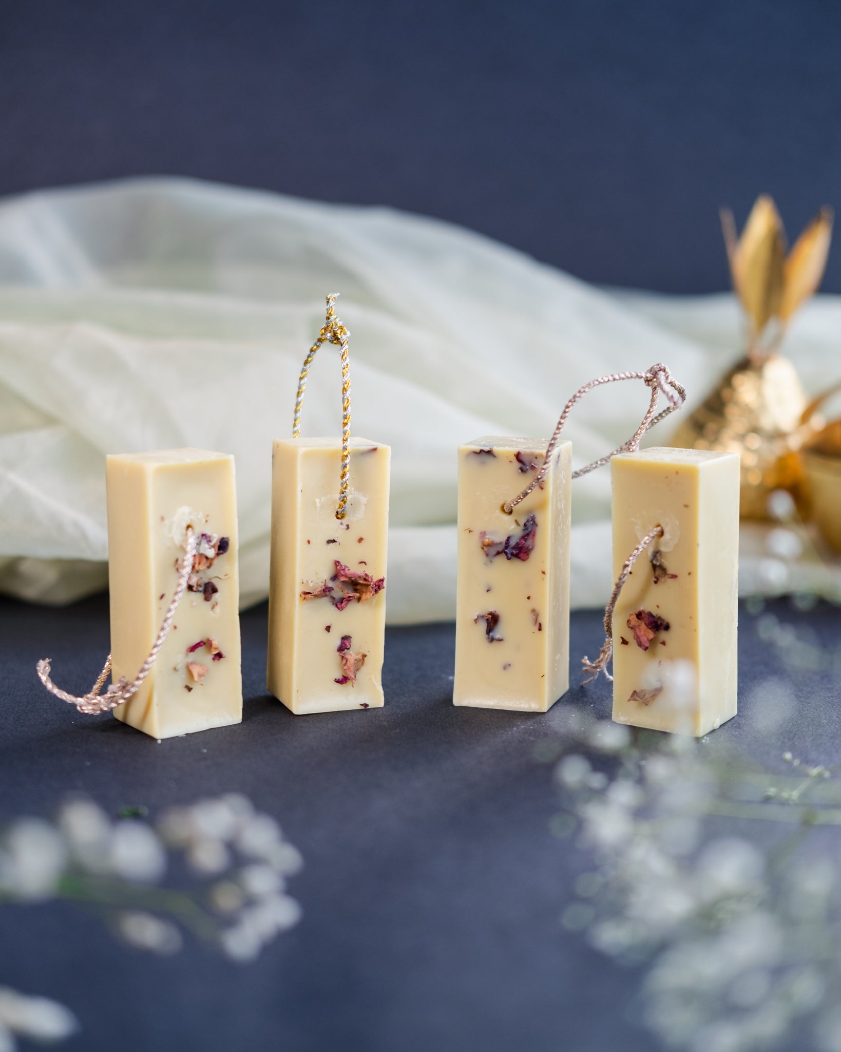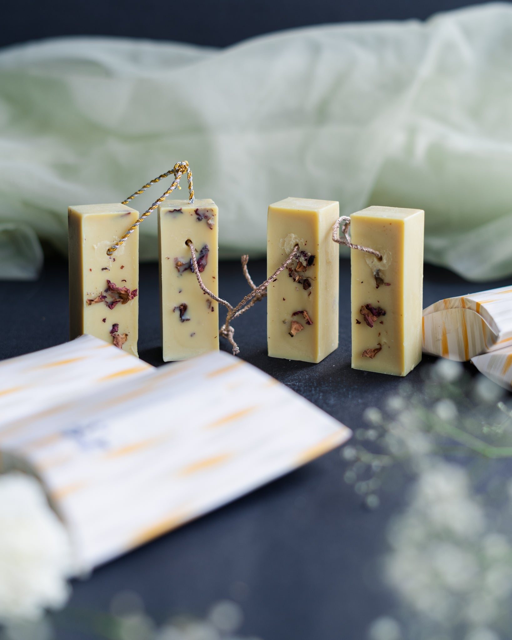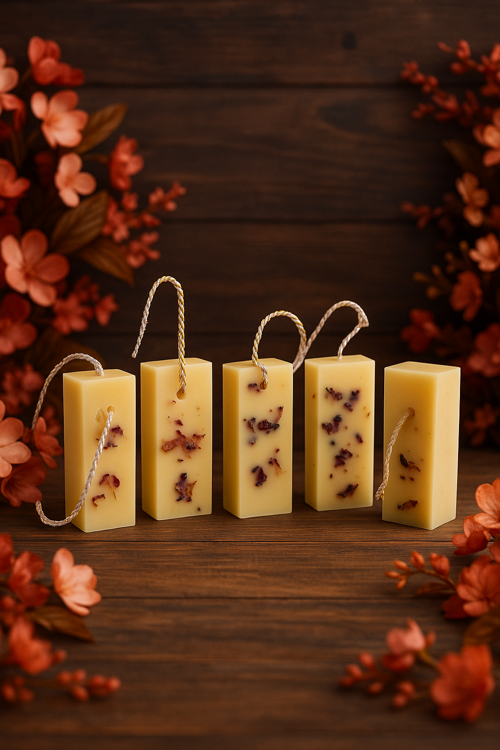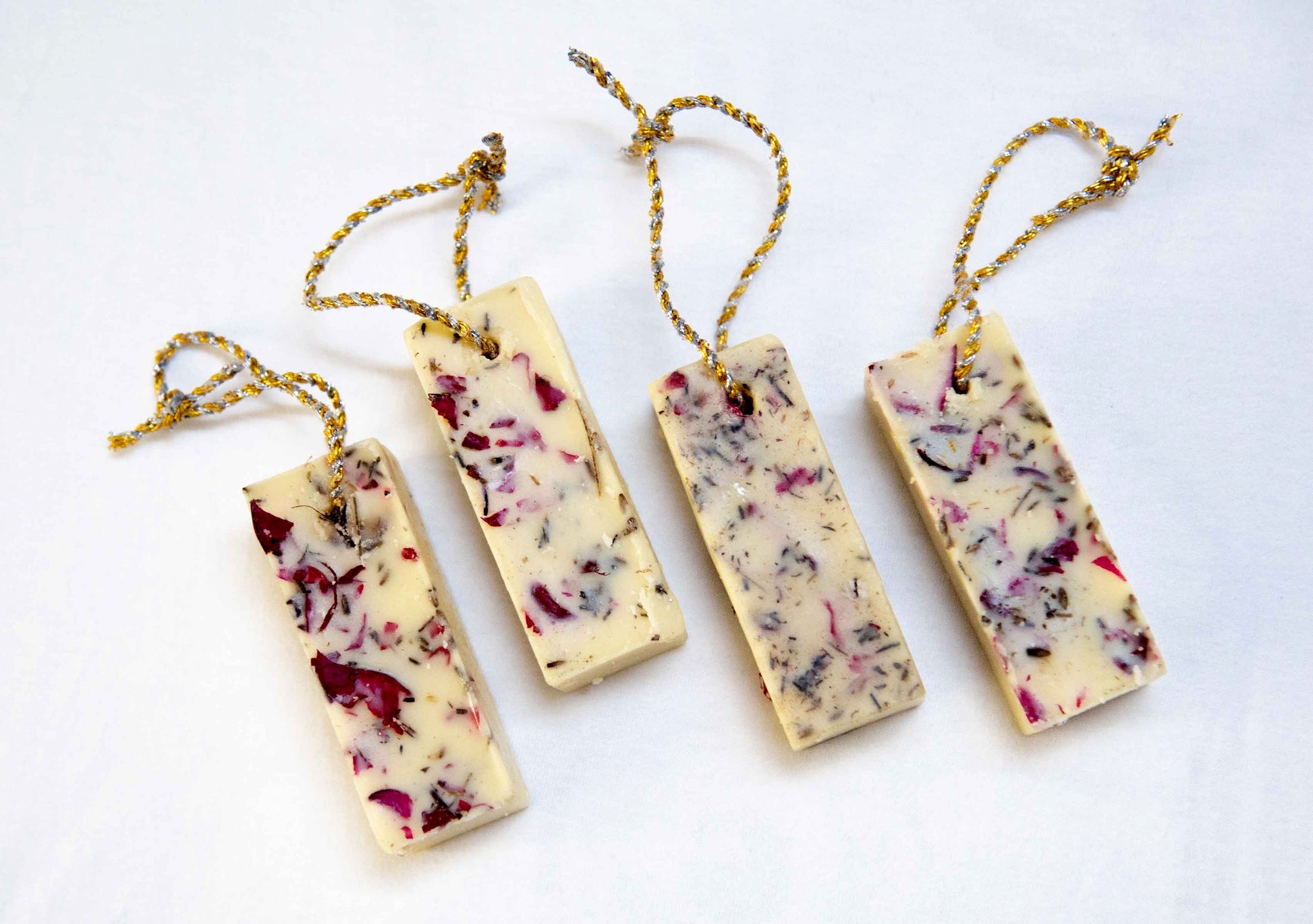 The beeswax tablets are a delightful addition to your closets/drawers or any small spaces. Available in 4 distinct fragrances : Cinnamon, Lemongrass , Tango Peel and Caribbean Escape. Each tablet is hand poured and infused with all natural rose petals, marigold petals and lavender buds. We can either hang them or keep them wrapped in muslin cloth .Please do not expose these tablets to sunlight and keep them away from pets and children.