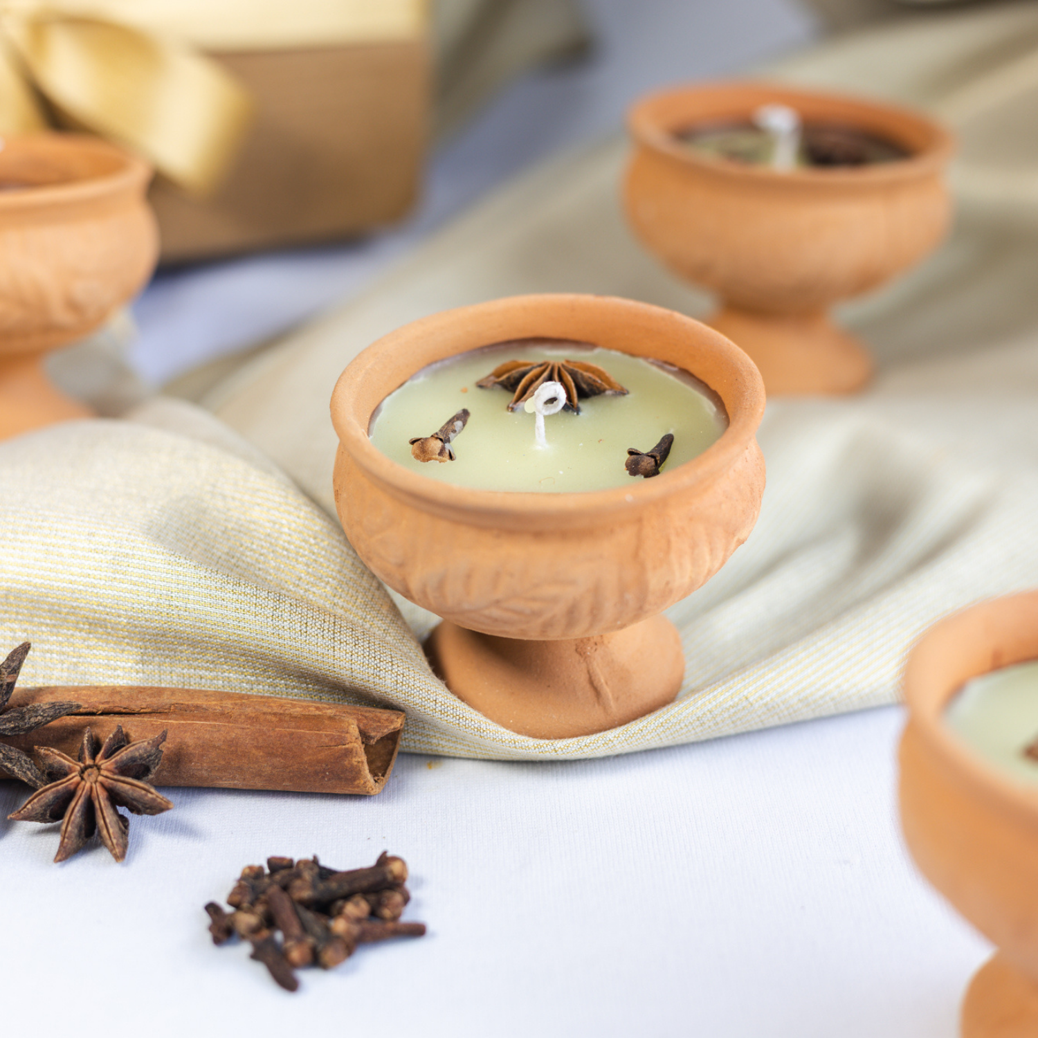 Traditional mitti/teracotta bowls filled with Jasmine fragrance wax and decorated with Indian Spice mix to lighten up your festivals.