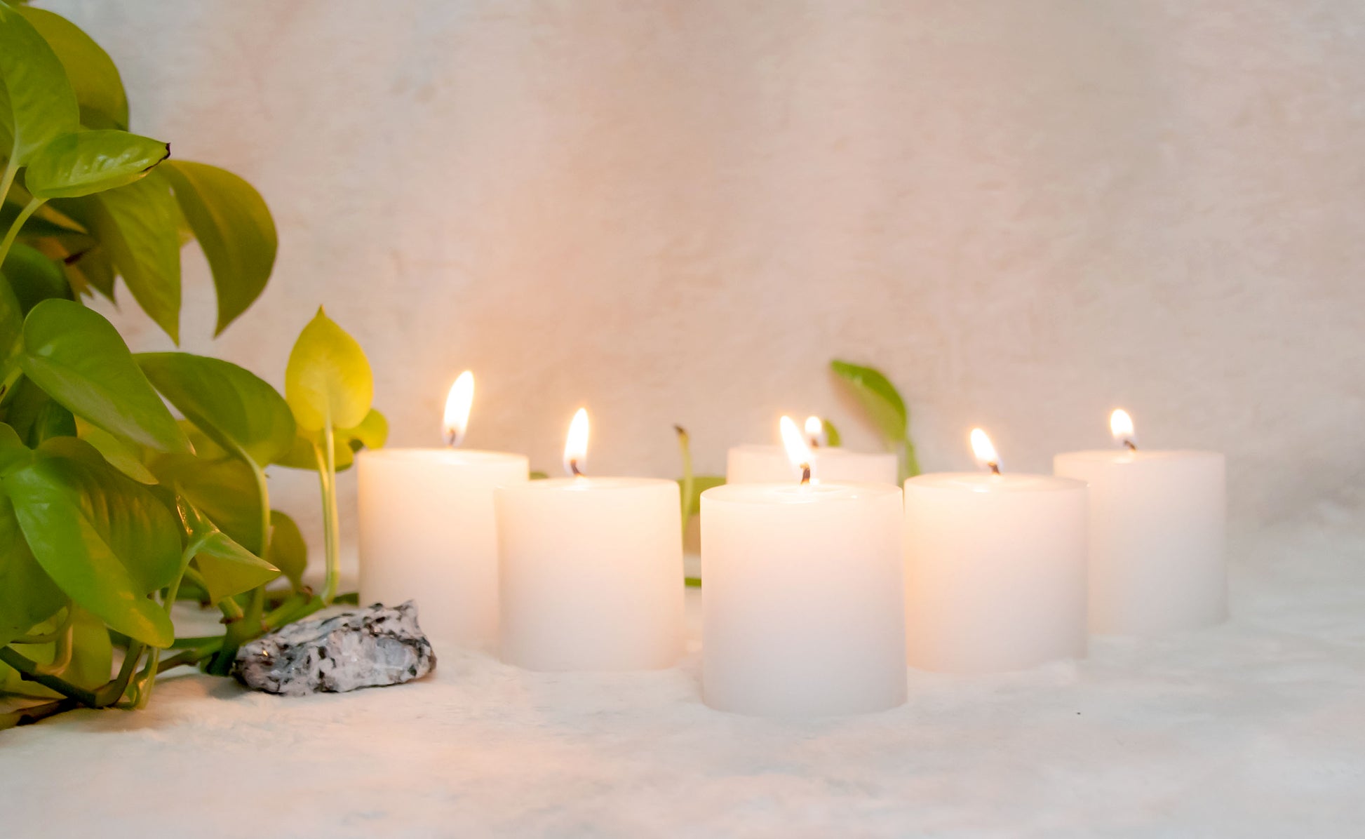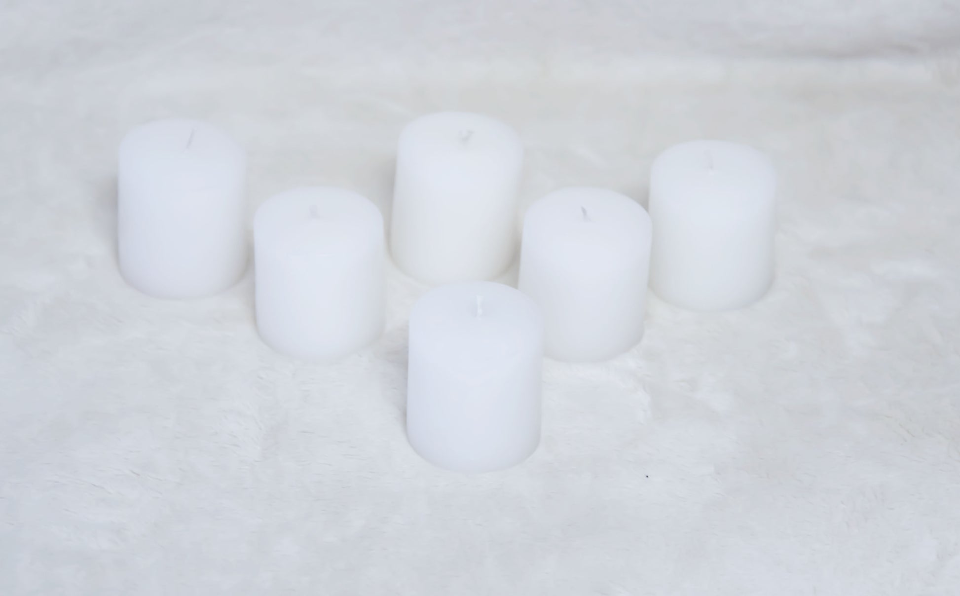 Set of 6 Unscented small pillar candles that will burn for 8 hours each and light up the ambiance.