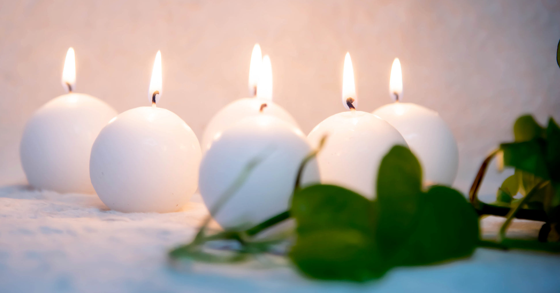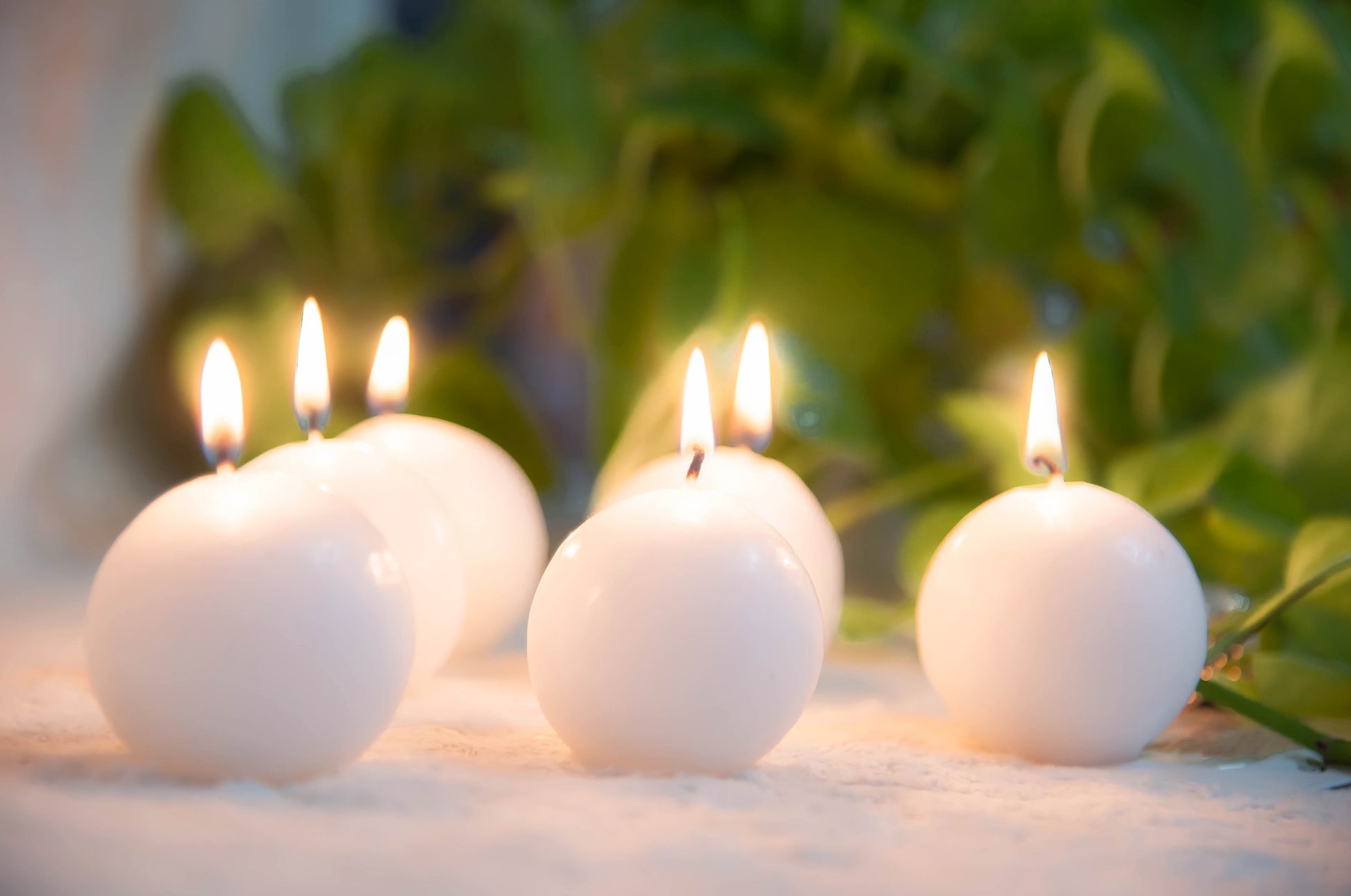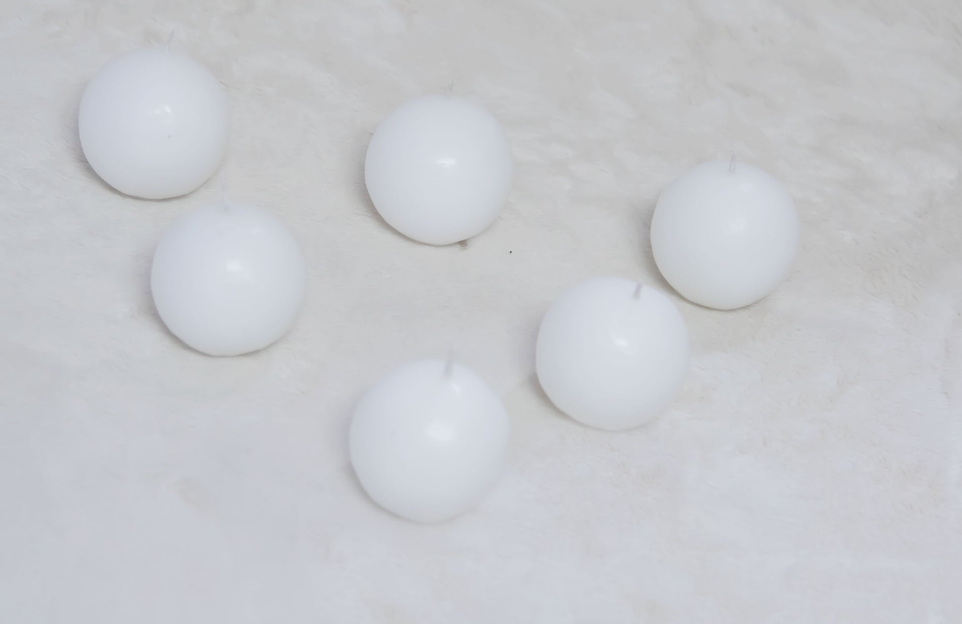 Set of 6 unscented hand poured round ball shape candles for weddings and festive decor.